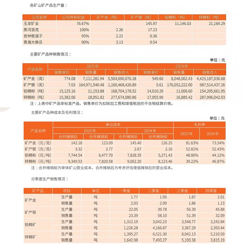 6、公司矿产金产量同比下降,我对比了一下24年年报各子公司矿产金数据,发现主要是青海大柴旦矿区产量下降0.5t,公司1--3季度产量均未达到2t,造成全年产量下降明显。其它银铅锌等相较去年总体持平,在白银大涨的前提下,公司矿产银的产量和毛利率均没有大幅提升?不知道原因出在哪了?