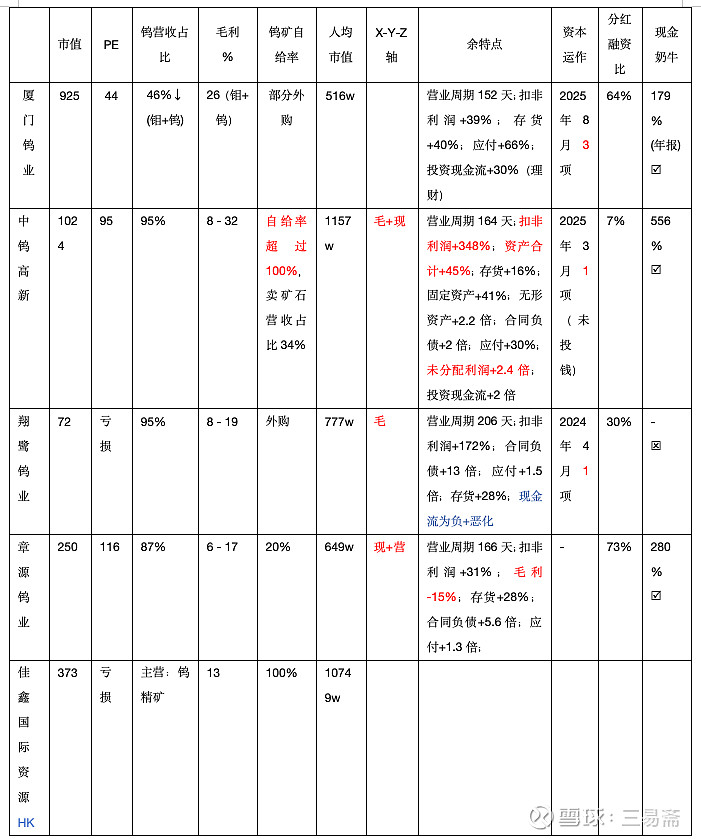 财务上看:1.毛利率大于20%的产品有:钨矿25%(中钨高新)、切削刀具32%(中钨高新)、钨钼等有色金属制品26%(厦门钨业,其中水分很大,因为以钼产品为主的上市公司:金钼股份:钼矿产品开采、冶炼及深加工 毛利39%,洛阳钼业:钼 毛利38%,可见平均后,26%的毛利率明显被夸大了);分析原因:厦门钨业虽然钨矿年产量MAX 1.5万吨,中钨高新钨矿年产0.78万吨,表面上比厦门钨业少,但是尚有年产钨矿加工品APT产量0.85万吨+硬质合金产量超0.75万吨,还原为钨矿年产MIN 2.38万吨,远高于厦门钨业,高毛利得益于中钨高新的矿石产量;而矿产类毛利率最高的在卖矿石环节,冶炼一般毛率很低,而中钨高新切削刀具毛利达到32%,中钨高新再加1分;2.市值方面:只有翔鹭钨业在100亿以下,股价容易爆发,中钨高新市值大于1000亿,是大屁股;3.主营业务方面,厦门钨业占比不足50%,钨涨价受益低于其他企业。
