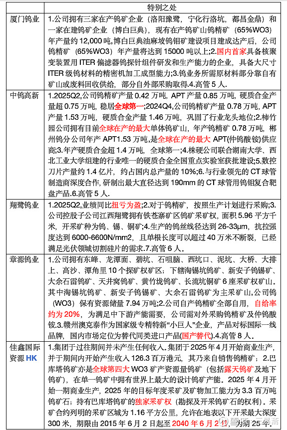 1.钨的特点:一种不可再生的稀缺资源,具有高密度(硬)、高熔点、高耐磨性、高电导率、高硬度等物理性质,是现代国民经济重要的基础材料和战略资源。被誉为“工业的牙齿”。基于其稀缺性及重要战略用途,多国将钨纳入“关键矿产清单”,中国明确限制对钨开采及出口,实施配额管理和“两用物项”管理措施。
