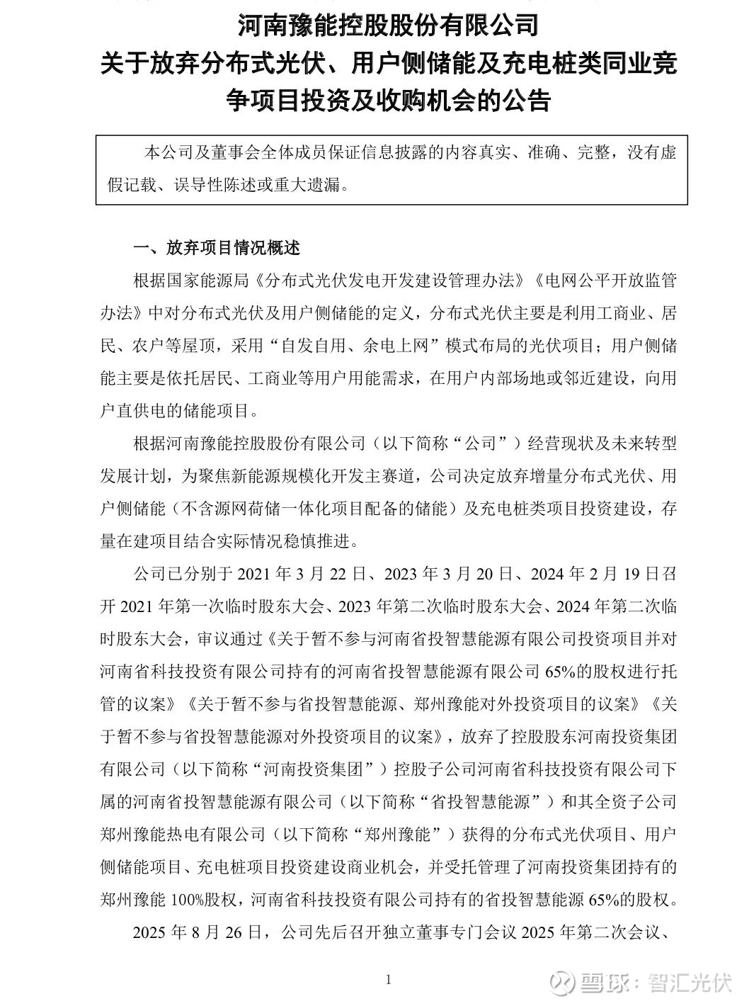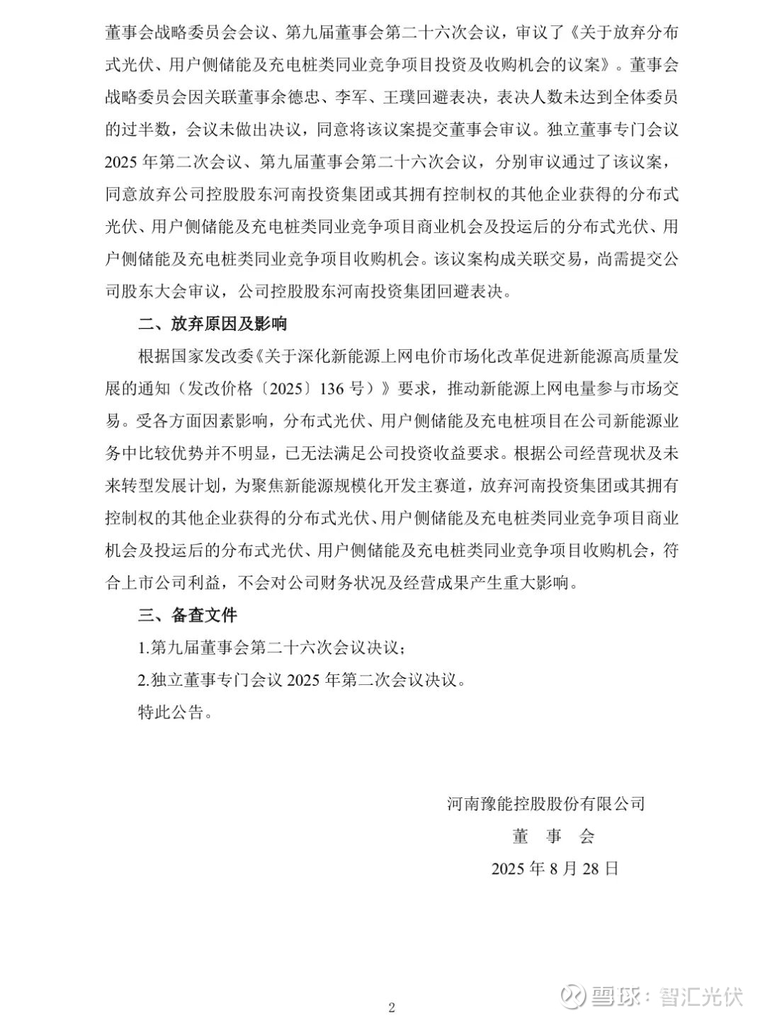 8月28日,豫能控股发布《关于放弃分布式光伏、用户侧储能及充电桩类同业竞争项目投资及收购机会的公告》(原文见附件)。根据公告,