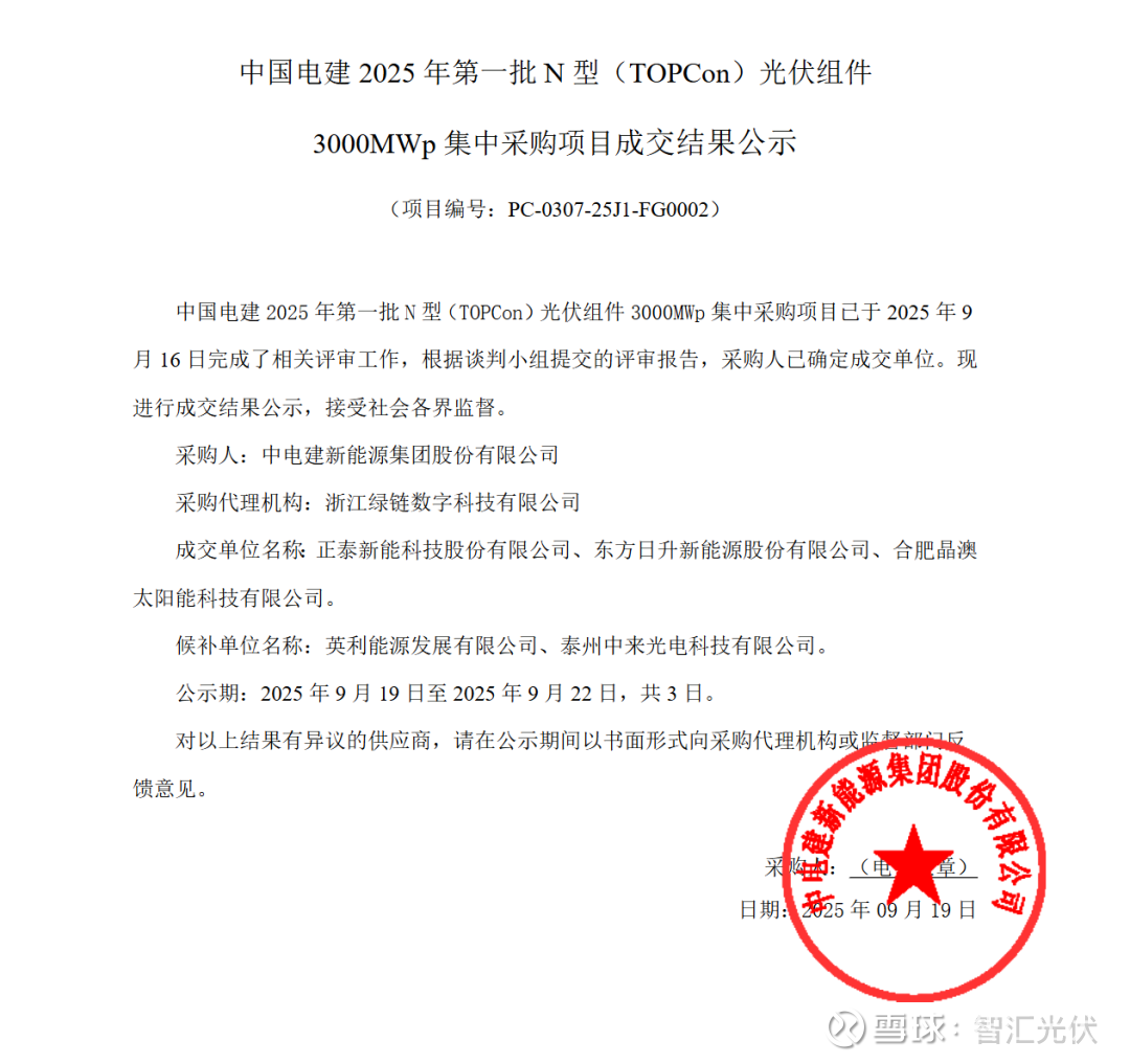 9月19日,中国电建发布《2025年第一批N型(TOPCon) 光伏组件3000MWp集中采购项目成交结果公示》,结果显示: