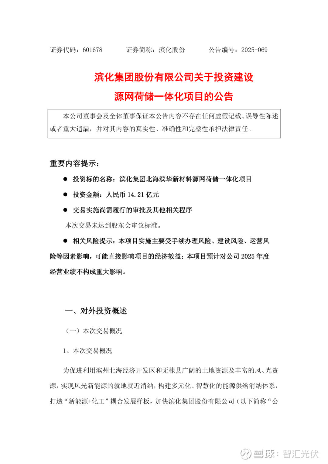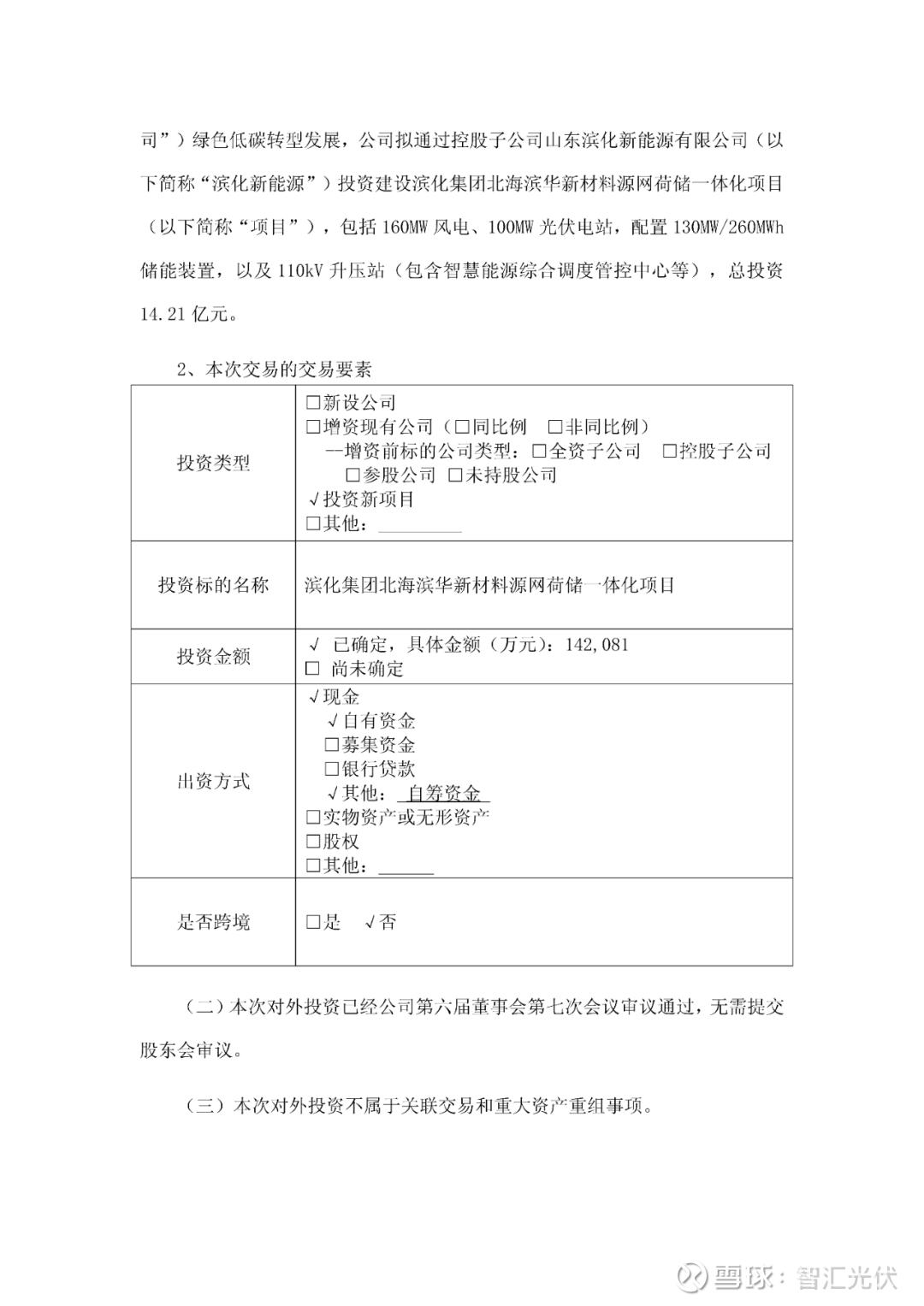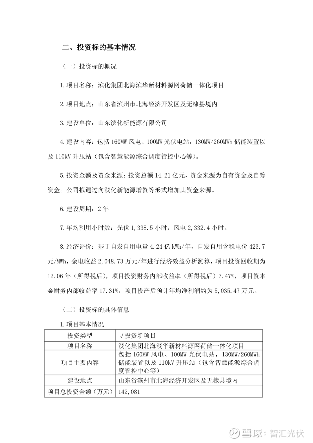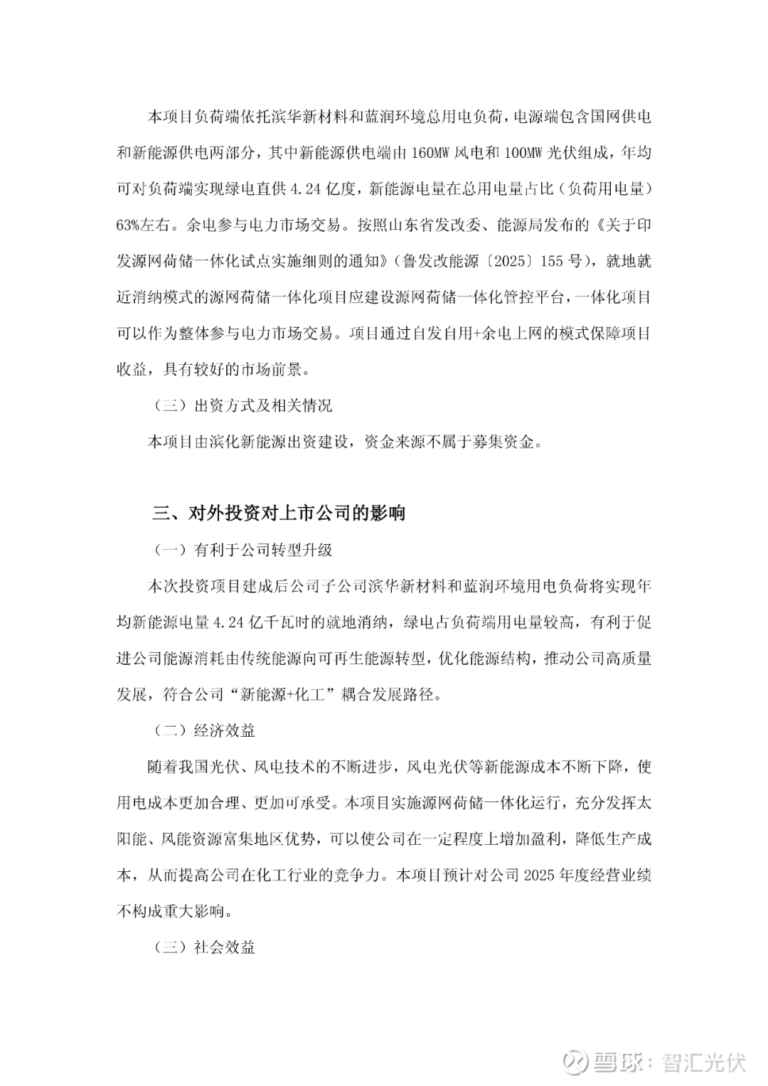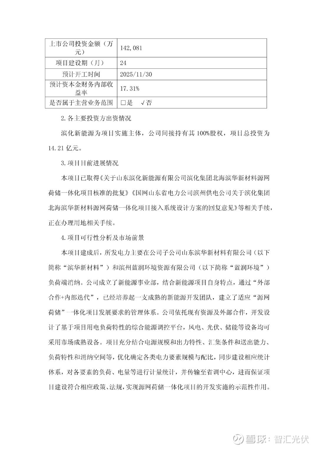 为构建多元化、智慧化的能源供给消纳体系,打造“新能源+化工”耦合发展样板,公司拟通过全资控股的山东滨化新能源有限公司,投资建设滨化集团北海滨华新材料源网荷储一体化项目,总投资约14.21亿元。