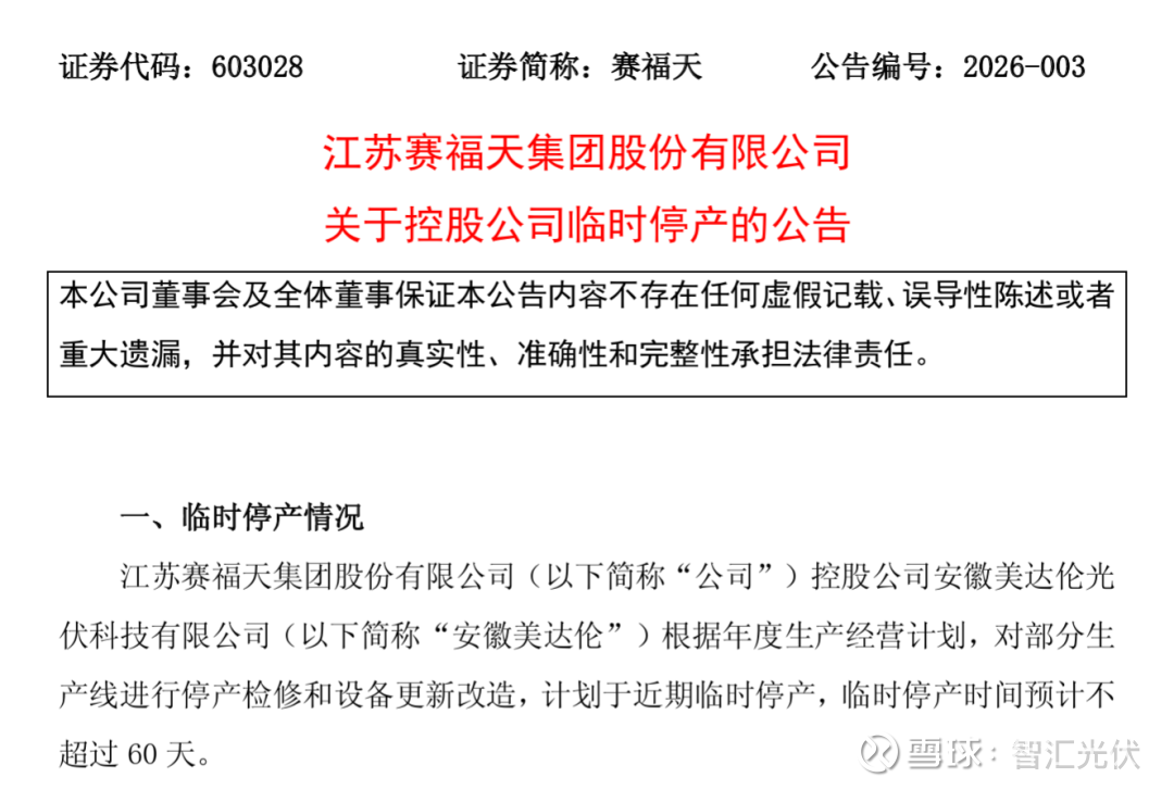 1月29日,赛福天发布公告,控股公司安徽美达伦根据年度生产经营计划,对部分生产线进行停产检修和设备更新改造,计划于近期临时停产,临时停产时间预计不超过60天。