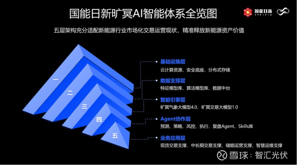 整个体系形成了全链路协同的完整技术闭环:以安全可控的云计算、分布式存储与全链路安全机制为基础设施层,以多元异构数据中台为核心数据支撑层,整合气象、交易、电网、负荷等全域数据;由旷冥气象大模型4.0、旷冥电力交易大模型1.0与强化学习机制构成核心智能引擎层,形成“感知-决策-自主进化”的多模协同体系;通过覆盖交易全流程的多智能体(Multi-Agent)“数字员工”集群实现全流程智能协同,最终面向新能源现货交易、中长期交易、储能参与交易、新能源智能运维等核心业务场景落地应用,真正实现“从数据到收益”的全链路价值闭环。