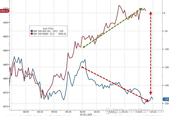 图里现在蓝线数值是-239,也就是现在标普500新高的时候,500支成分股,下跌的股票比上涨的股票多239只,非常不健康。