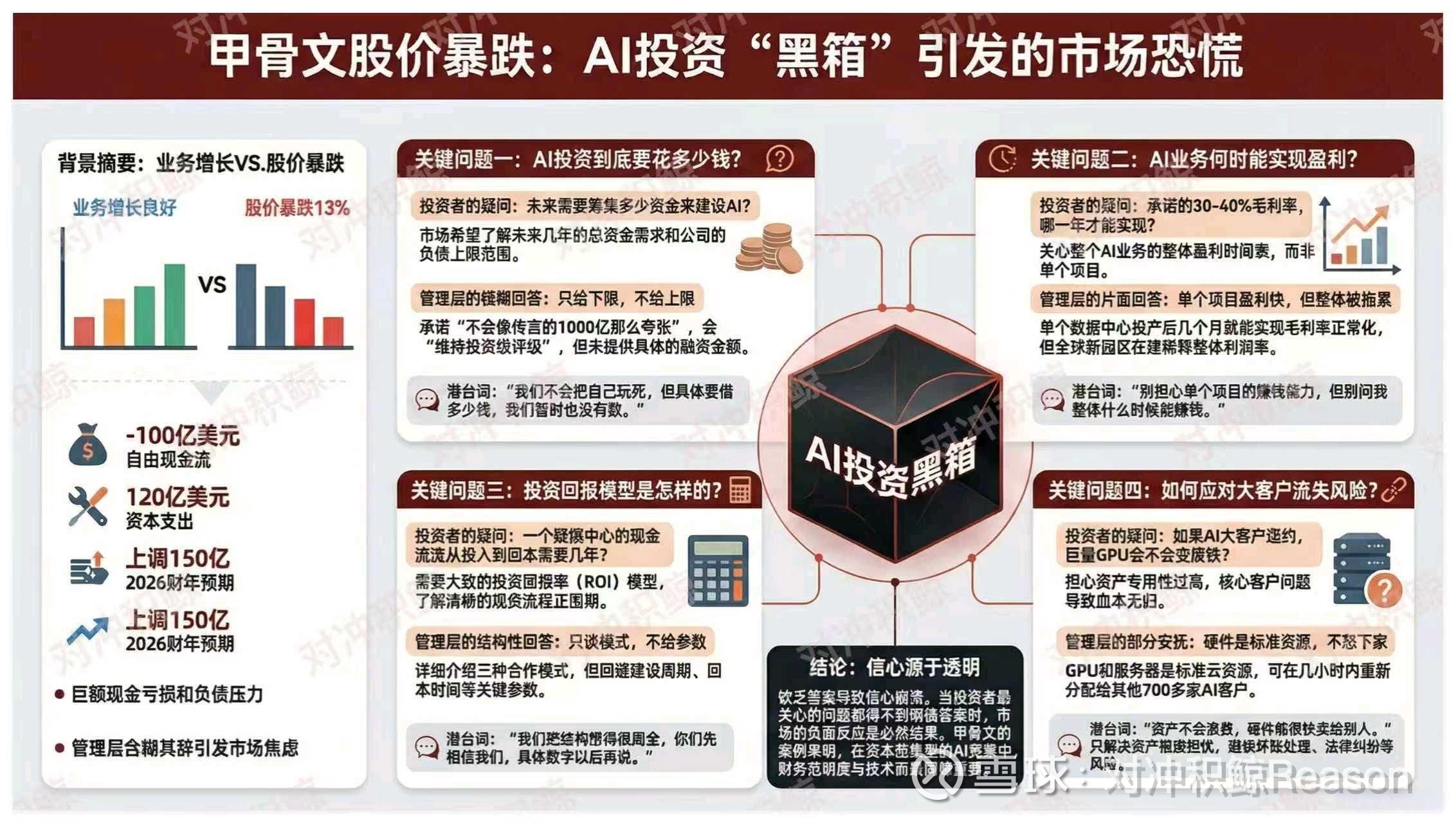 市场现在对 AI 资本支出已经极度敏感,在这种环境下讲故事可以很浪漫,但不能在钱的问题上含糊。Oracle 这次财报电话会,增长讲得很兴奋,融资讲得很模糊,结果就是股价暴跌。