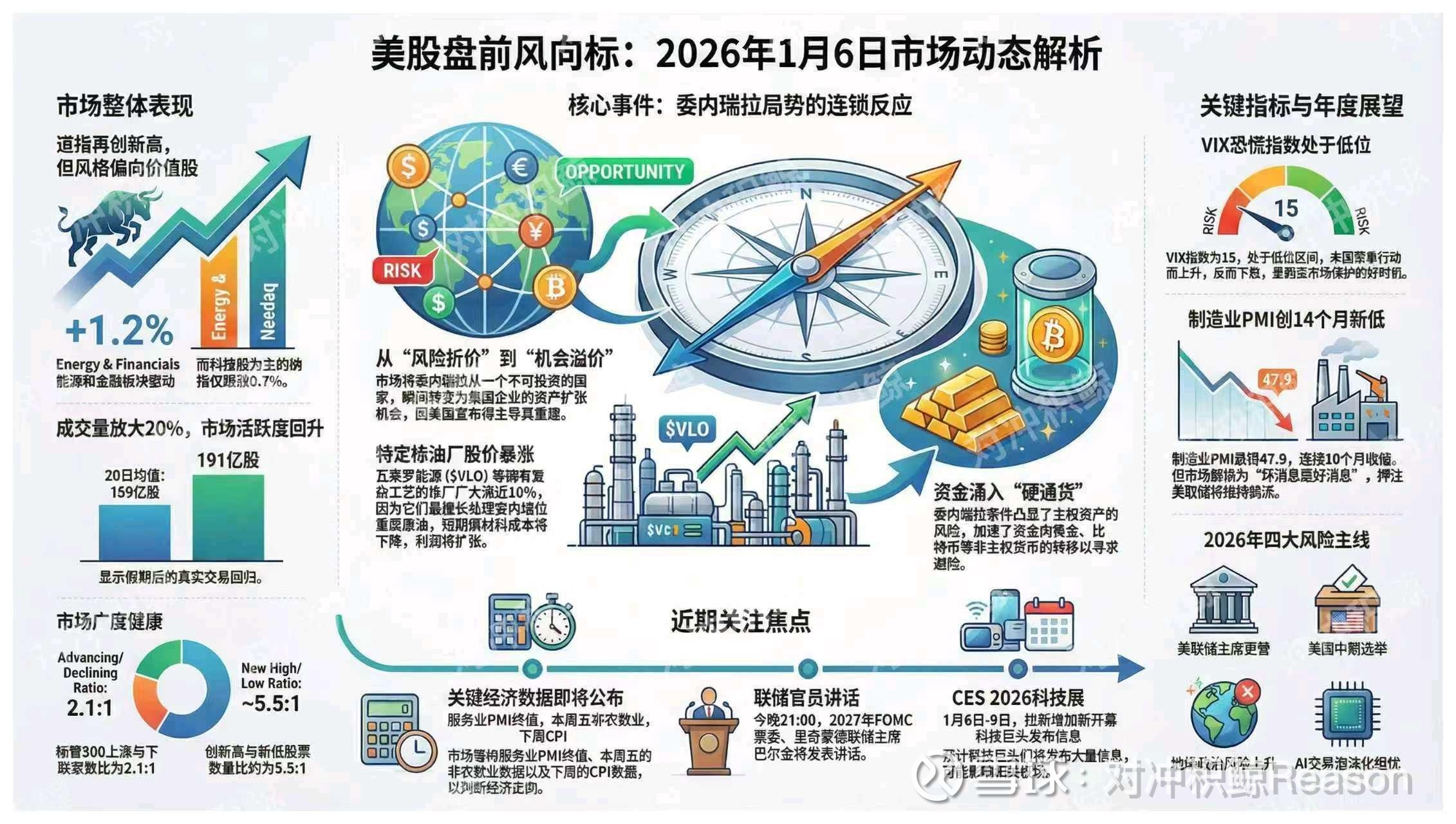 4,市场对马杜罗被捕的反应伴随 VIX 下跌,其实是对委内瑞拉主权风险的归零重估,从风险折价变成机会溢价。作为拥有全球最大已探明石油储量的国家,委内瑞拉在过去十年里因为制裁和管理不善而游离在全球能源市场边缘。美国政府宣布将接管该国直至平稳过渡,并明确表示美国能源公司将主导其基础设施的重建 ,这在投资者眼中等于将委内瑞拉从一个不可投资的失败国家瞬间转化为美国企业的资产负债表扩张机会。