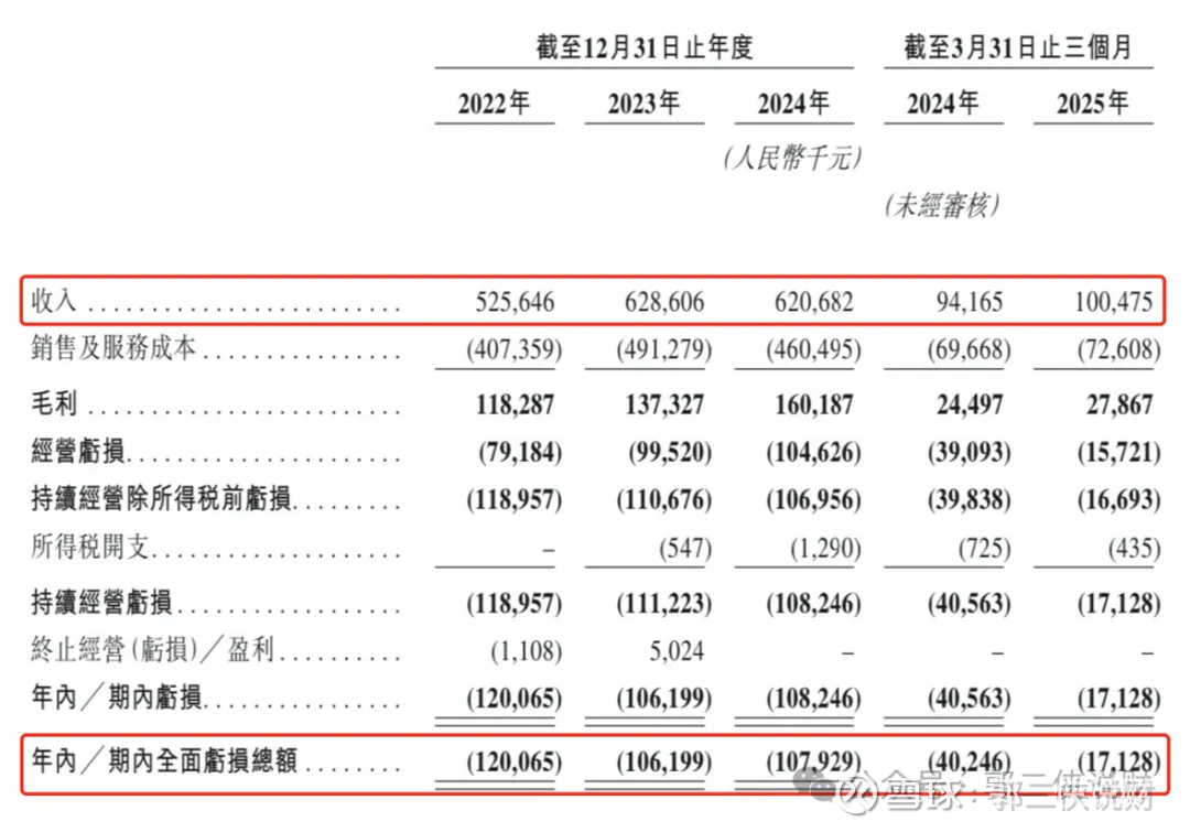财务数据显示:2022年~2024年,公司总收入分别为人民币5.26亿元、6.29亿元和6.21亿元;同期净亏损分别为人民币1.20亿元、1.06亿元和1.08亿元。