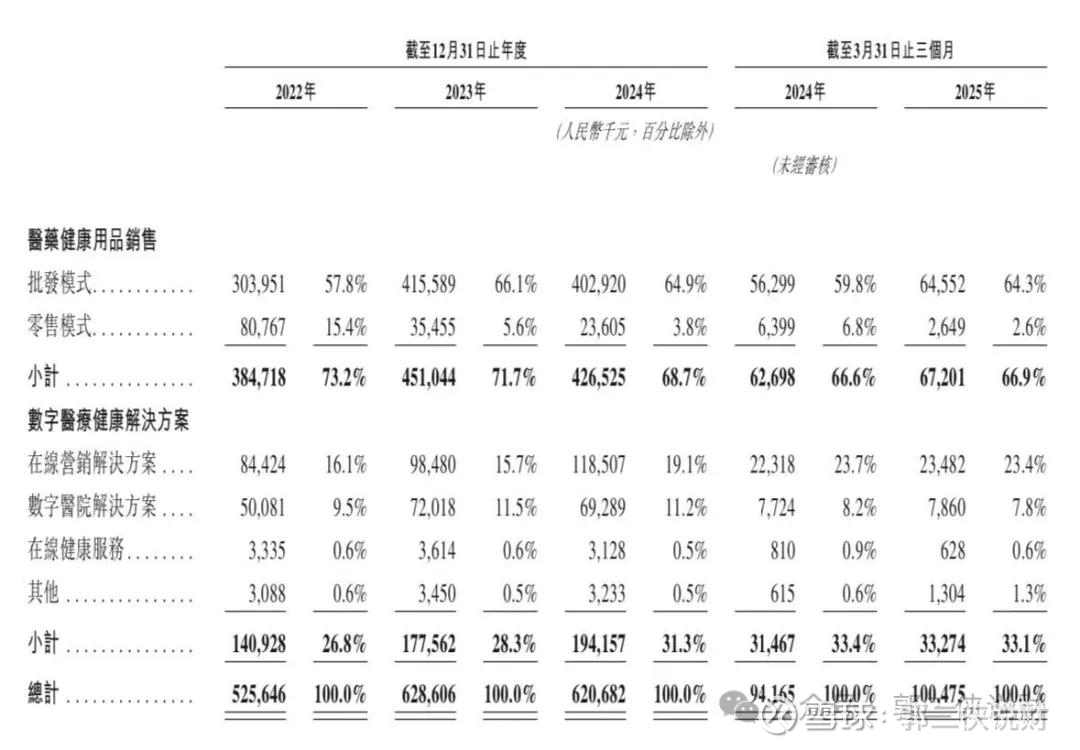 医药健康用品销售采用批发与零售双模式。批发模式主要服务区域医药贸易公司、医疗机构等企业客户,是公司的收入支柱,2025年第一季度占比达64.3%。