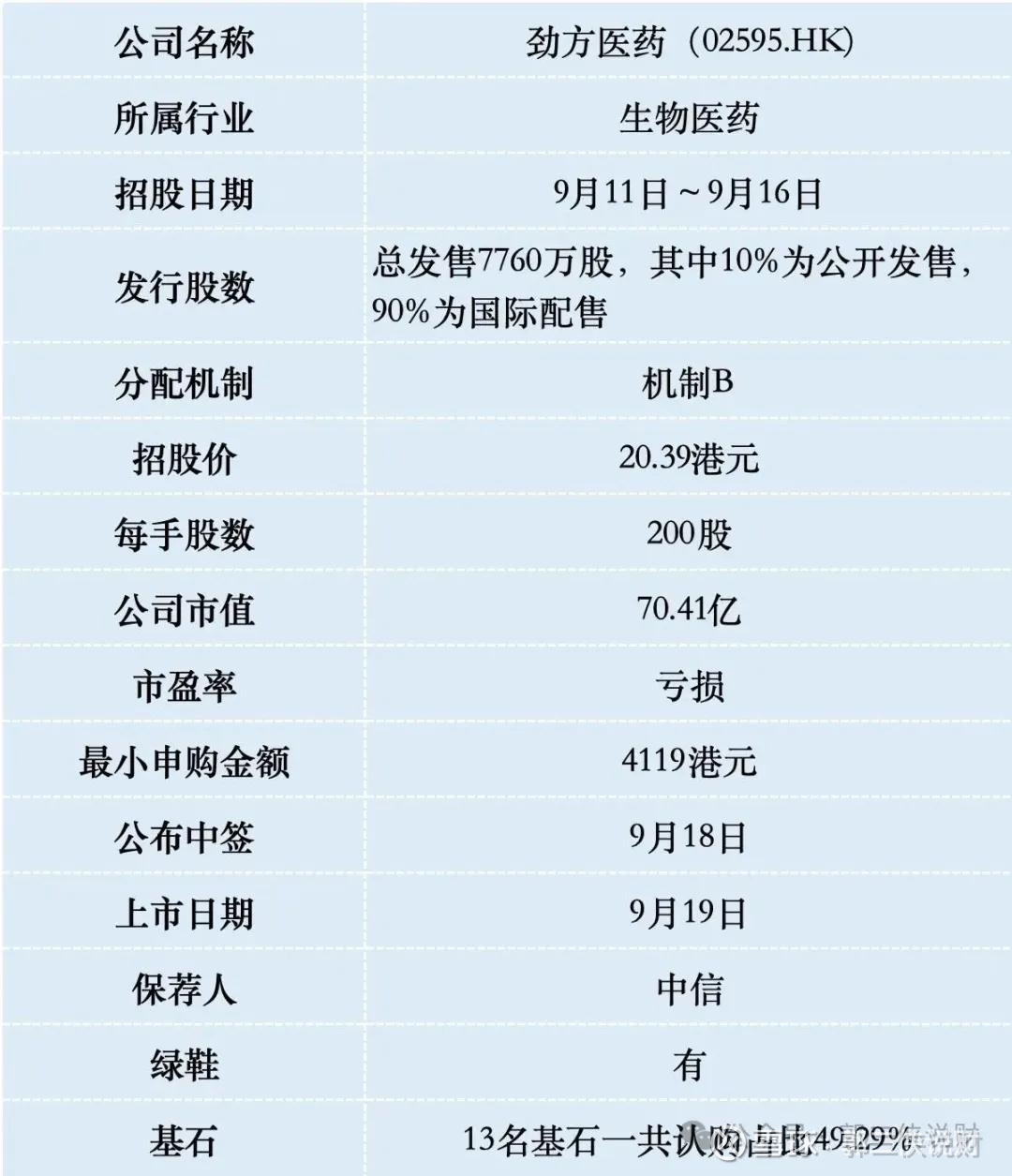 劲方医药本次IPO发行股份占全部股份比例的22.47%,按招股价20.39港元算,募资约15.82亿,13名基石投资者合共认购1亿美元(约7.8亿港元)的发售股份,剩余流通盘8亿港元,对市值只有70亿的新股来说,这个流通盘已经很大了。