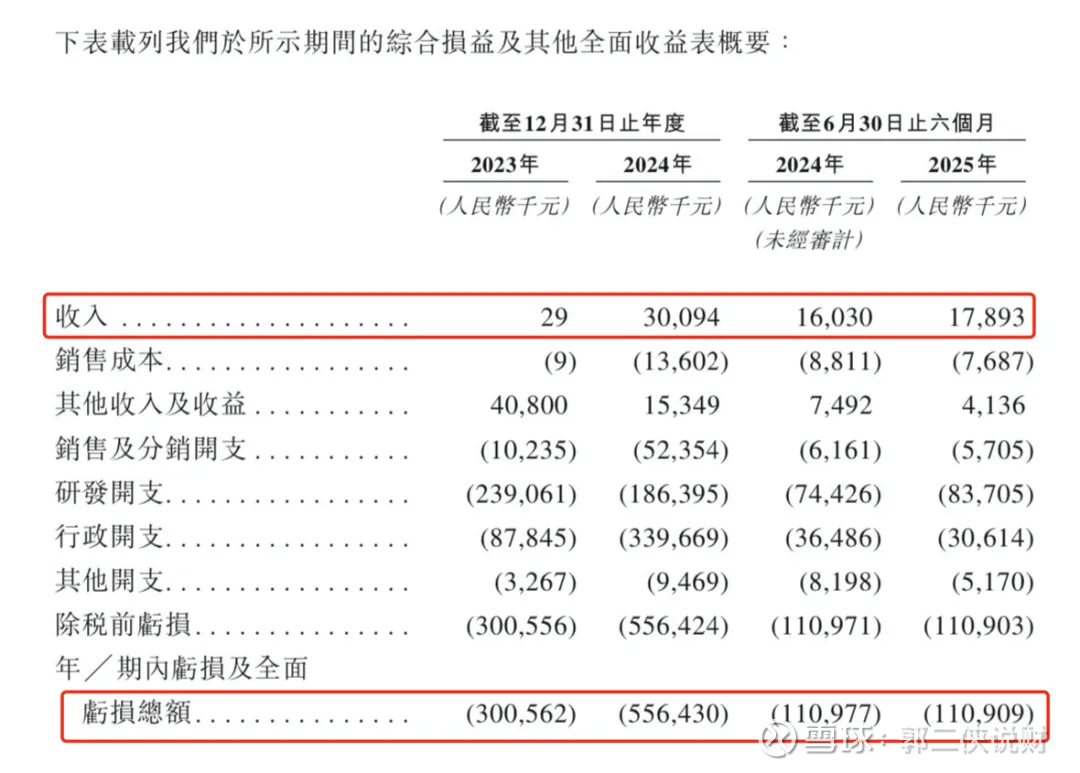 公司2023年、2024年和2025年前6个月的净亏损分别为3.01亿元、5.56亿元和1.11亿元人民币,两年半累计亏损已超过9亿元。亏损扩大的主要原因是,持续高额的研发投入,以及行政开支大幅增加(主要由于以股份为基础的薪酬支出增加)。