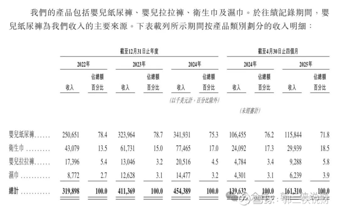 按产品划分,婴儿纸尿裤是公司绝对主力产品。2022年至2024年,婴儿纸尿裤销售收入从2.51亿美元增长至3.42亿美元,但占总收入比重从78.4%降至75.3%。2025年前四个月,这一比例进一步降至71.8%。
