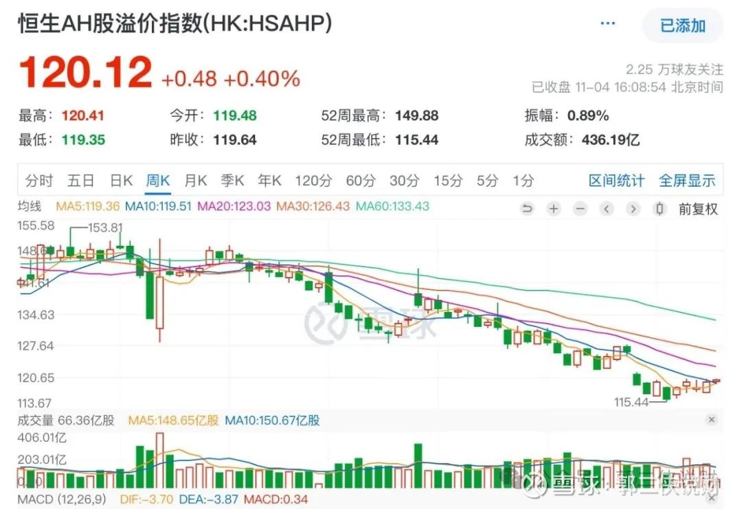 由于港股市场流动性没有A股好,港股相对于A股普遍存在折价现象。当前,恒生AH股溢价率指数为120,这意味着A股整体比港股贵了20%。