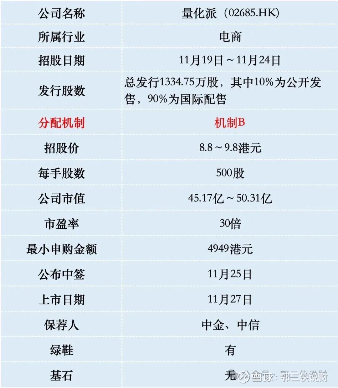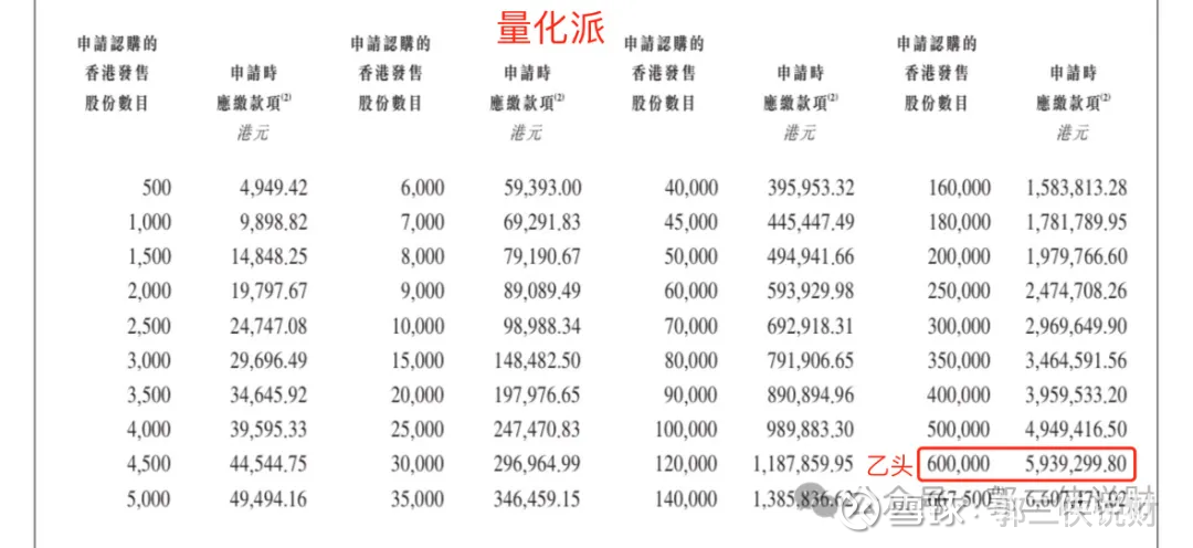 量化派招股首日孖展253倍,最终大概率会超购1万倍,甲乙组各1335手。按照20万人申购算,预估一手中签率低于1%,甲组全部抽签。