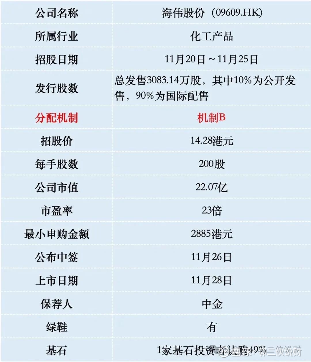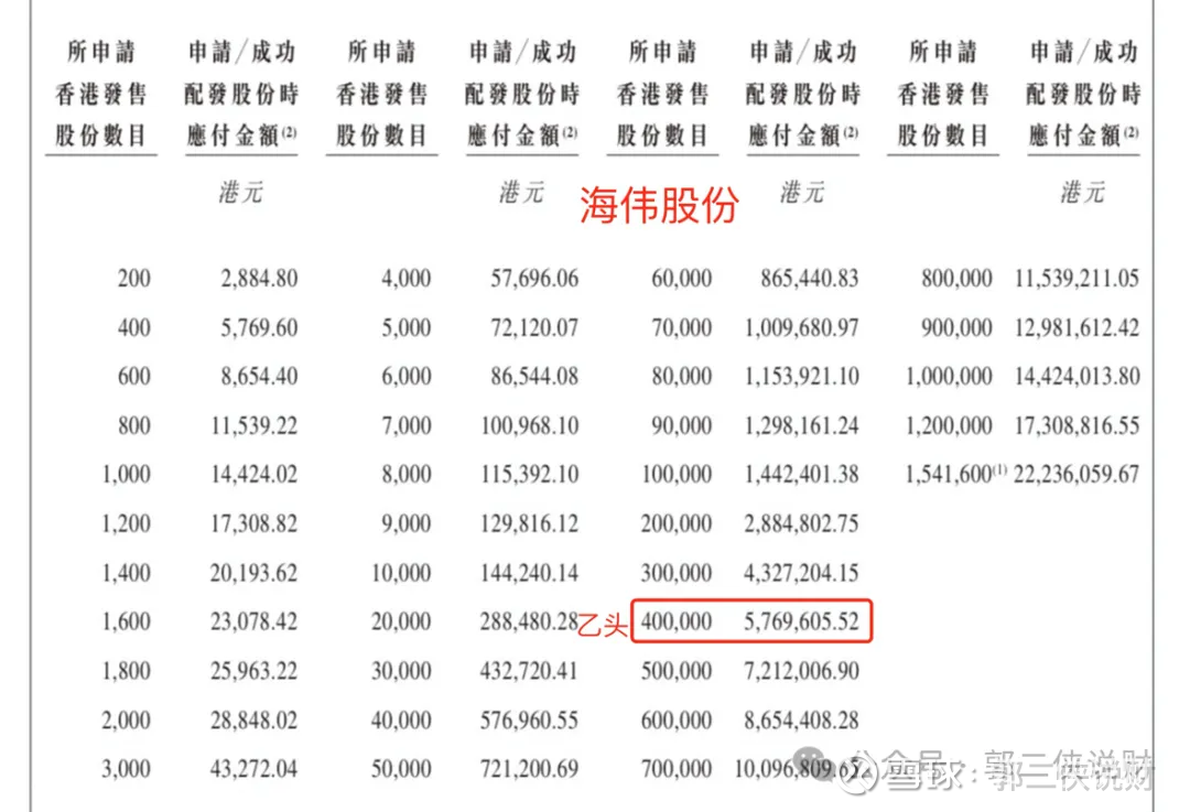 海伟股份招股首日孖展72倍,最终大概率会超购5000倍,甲乙组各7708手。按照20万人申购算,预估一手中签率1%,甲组全部抽签。
