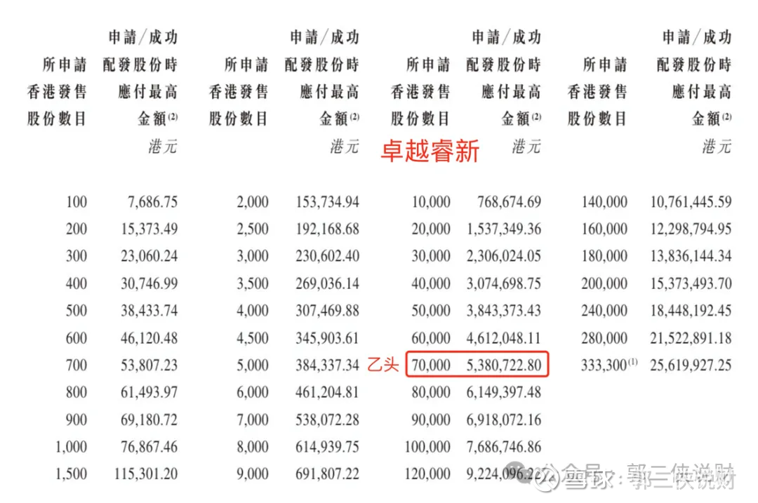 卓越睿新目前孖展1010倍,最终大概率会超购2000倍,甲乙组各3333手。按照10万人申购算,预估一手中签率1%,甲组全部抽签。