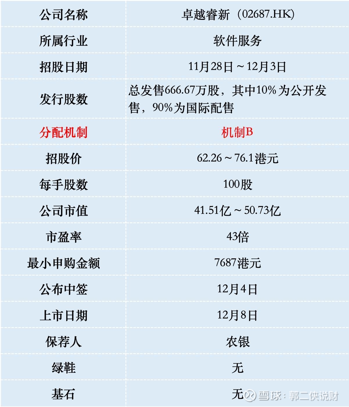卓越睿新本次IPO发行股份占全部股份比例的10%,按招股价上限76.1港元算,募资5.07亿,没有基石投资者都是流通盘。