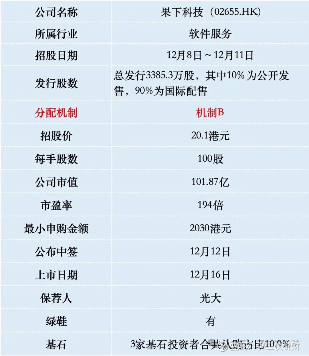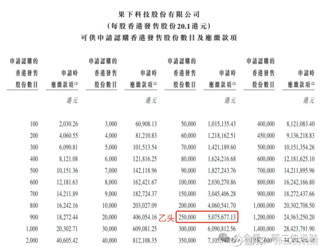 果下科技招股孖展27倍,最终大概率会超购1500倍,甲乙组各16926手。考虑到最近港股打新热情有所下降,以及后续有其他新股招股撞车,会分流一部分打新人。申购人数按照10万人算,预估一手中签率5%,甲尾中签1手。
