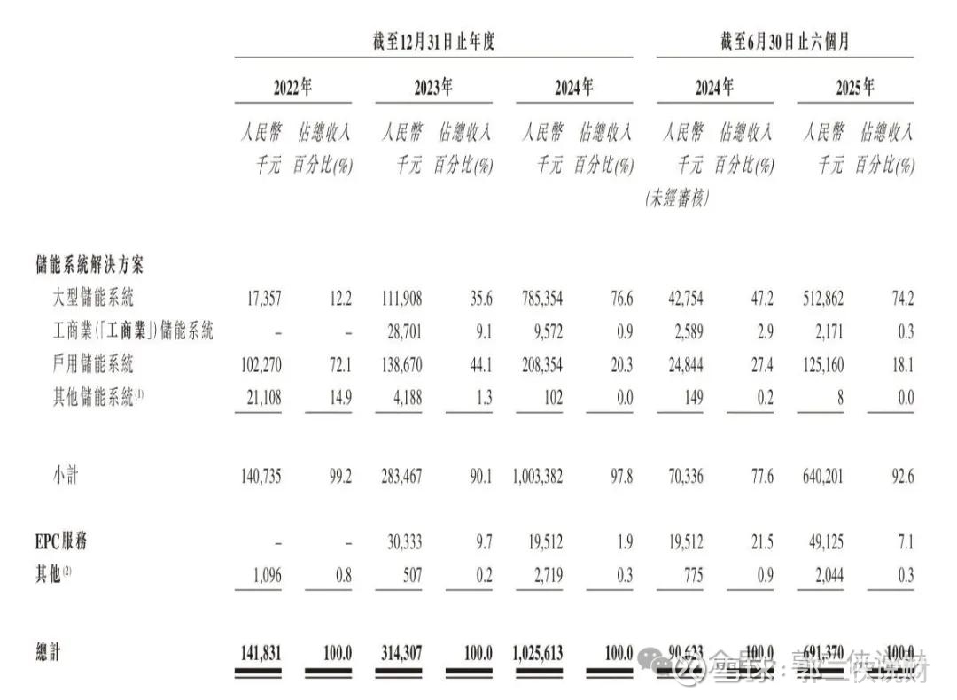 这项核心业务内部又可细分为大型储能系统、户用储能系统和工商业储能系统。其中大型储能系统从辅助业务跃升为支柱业务,收入占比从2022年的12.2%迅猛提升至2024年的76.6%,并在2025年上半年保持在74.2%的高位,成为驱动公司营收规模扩张的主要引擎。