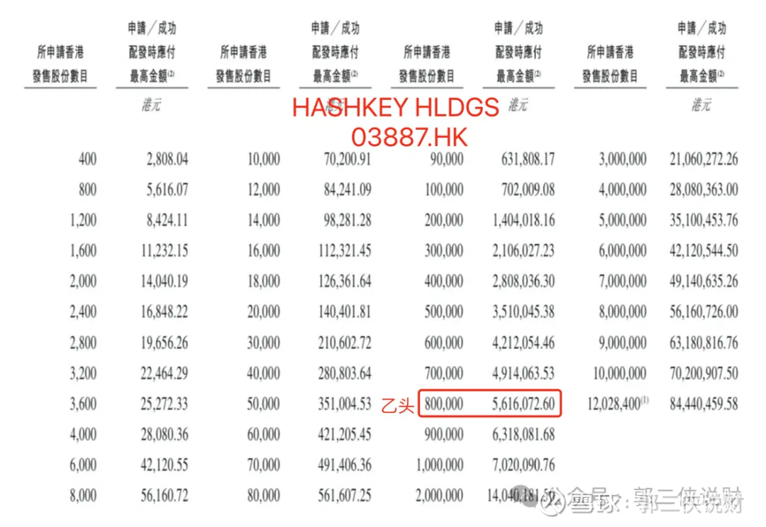 HASHKEY招股首日孖展53倍,最终大概率会超购1500倍,甲乙组各30125手。按照25万人申购算,预估一手中签率5%,甲组全部抽签。