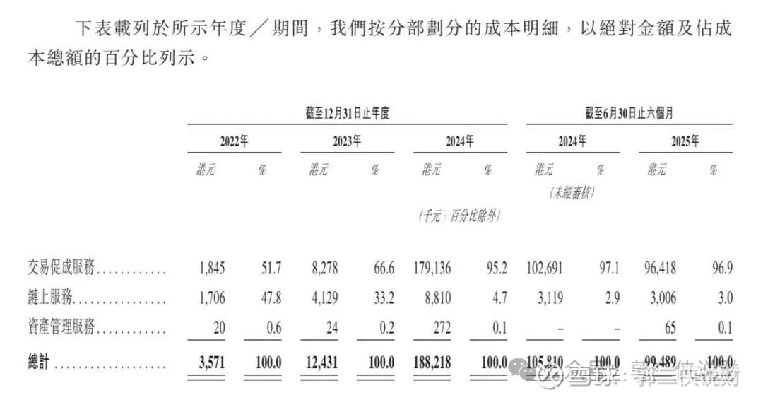 交易促成服务是公司最主要的收入来源,这项业务是为客户提供合规的数字资产交易服务。截至2025年9月30日,公司数字资产交易所累计促进现货交易量达1.3万亿港元。公司交易量从2022年的42亿港元大幅增加至2023年的3280亿港元,2024年进一步增至6384亿港元。