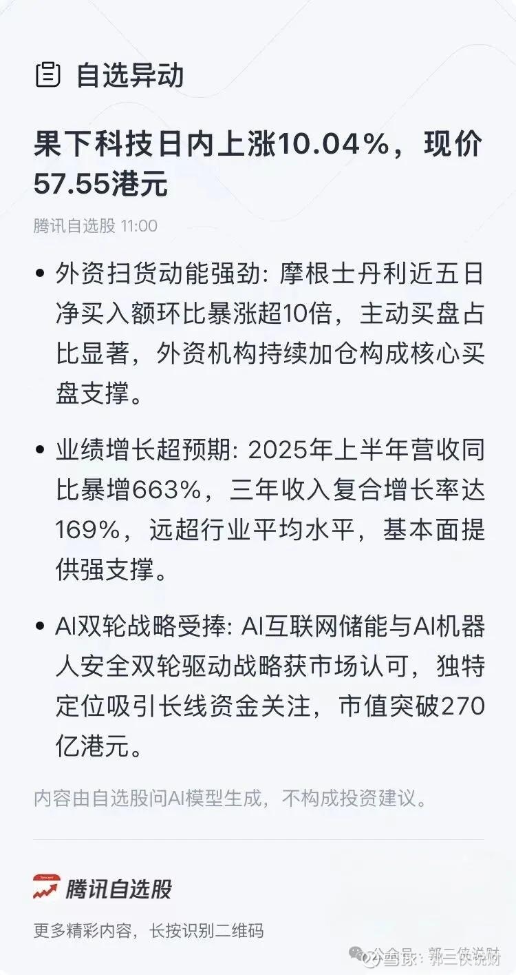 外资大行疯狂加仓果下科技 (02655),AI 互联网储能 + AI 机器人安全第一股,股价创历史新高!智通财经 APP 获悉,2026 年 1 月 16日,新年伊始,AI 互联网储能 + AI 机器人安全第一股,果下科技 (02655) 迎来爆发 —— 股价收于 59.95港元,单日涨幅达14.63%,市值突破 300亿港元,创上市以来的历史新高!