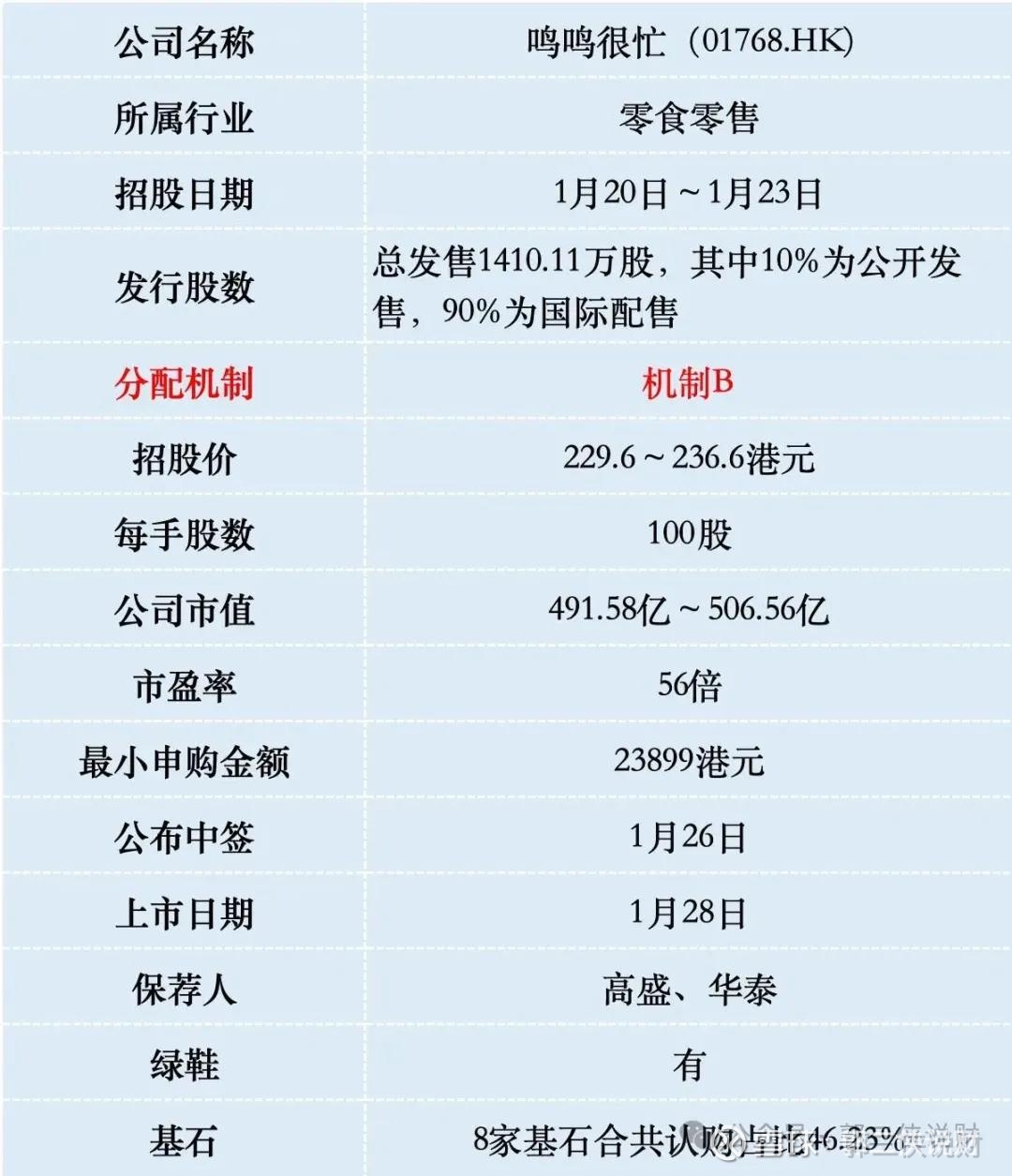 鸣鸣很忙本次IPO发行股份占全部股份比例的6.59%,按招股价上限236.6港元算,募资33.36亿港元,8名基石投资者锁定1.95亿美元(约15.2亿港元),流通盘18.16亿。