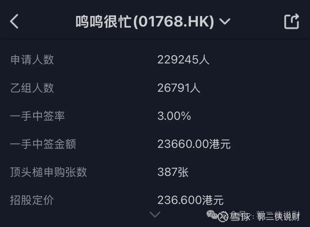 鸣鸣很忙在港股上市首日飙涨80%,一手净赚1.9万。此次共有23万人参与申购,冻结资金高达6346亿港元,其中国配超额认购达44倍,创下港股IPO历史上国配认购的最高纪录。