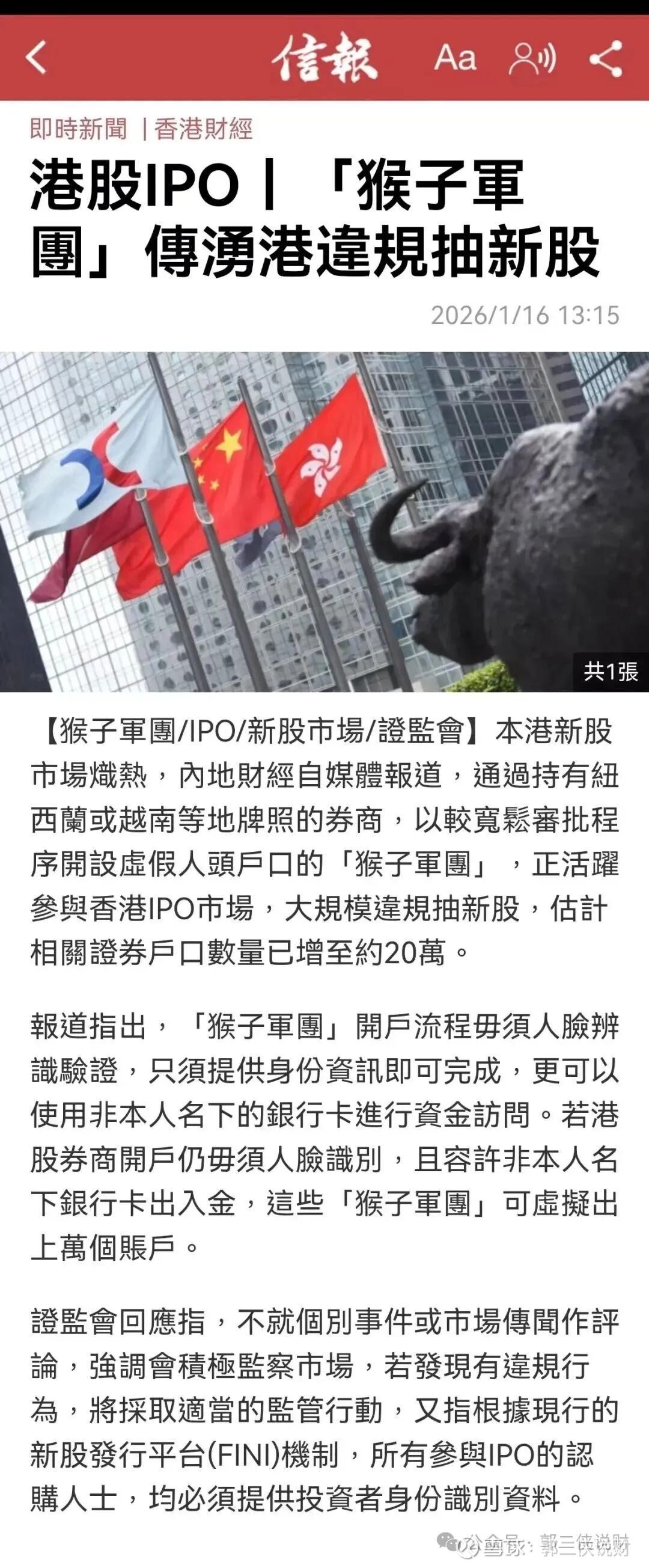当然,也有专家辟谣称不存在"猴子军团",理由是港交所新股分配结果公告了申购中签者的身份证号码。这种辟谣没有抓住重点,身份证号是真的没有问题,猴子军团开户的时候没有扫脸,本人根本不知情,只需购买一些身份证号码即可操作,而且出入金也不是本人同名银行卡,例如用U,这些高高在上的砖家根本不懂下面的野路子。