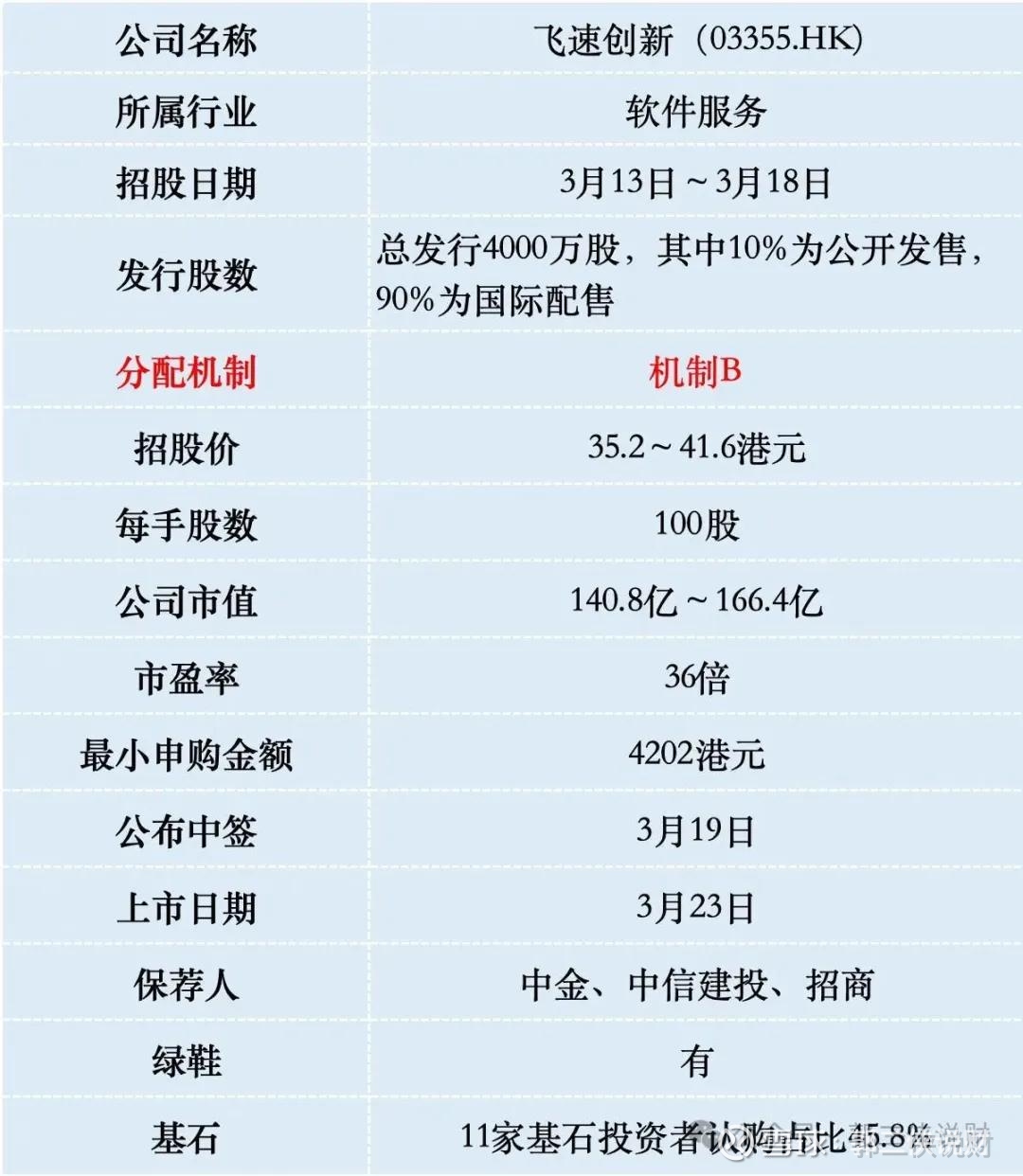 飞速创新本次IPO发行股份占全部股份比例的10%,按招股价上限41.6港元算,募资16.64亿港元,11家基石锁定7.04亿,剩余流通盘9.6亿。