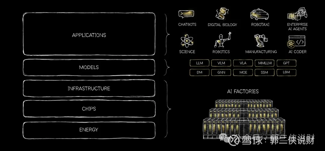 黄仁勋将AI产业拆解为五层:能源、芯片、基础设施、模型、应用。但关键不在于分层,而在于他提出的动态逻辑——“每一个成功的应用都会向下拉动它下面的所有层,一直延伸到维持它运转的发电厂。”