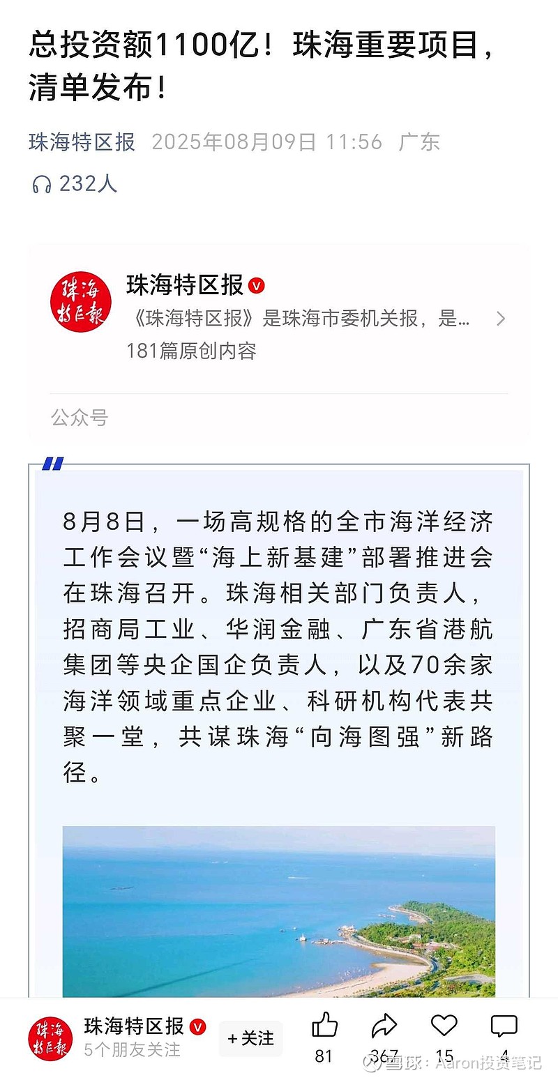 一系列“海上新基建”重磅签约落地,多项创新举措陆续公布,珠海正聚力攻坚,目前“海上新基建”项目清单已发布,涵盖108个重点项目,总投资额达1100亿元。其中已签约项目65个,投资292亿元;意向项目投资额达808亿元。$珠海港(SZ000507)$