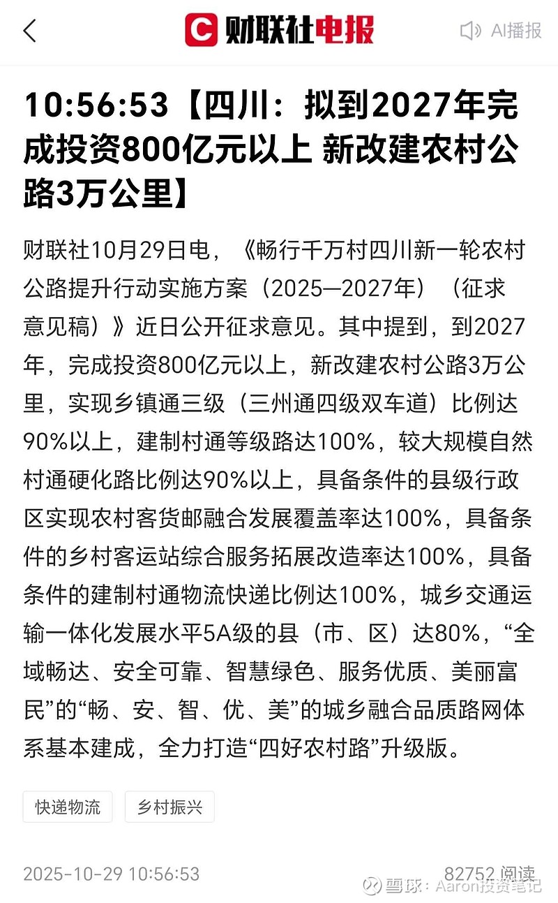 《畅行千万村四川新一轮农村公路提升行动实施方案(2025—2027年)(征求意见稿)》四川抛出2025-2027年“800亿元+3万公里”改建农村公路大计划。1. 成都路桥:专注川内中小道路,农村公路订单占比高。2. 四川金顶:四川水泥+骨料龙头,每公里农村路≈400吨水泥,3万公里带来千万吨级增量。$成都路桥(SZ002628)$ $四川金顶(SH600678)$