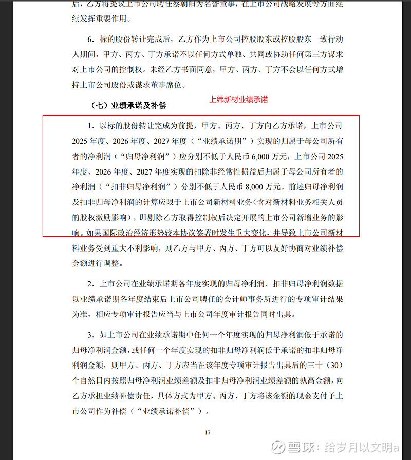 1、上纬新材:要求限于上市公司新材料业务(剔除控制权转让新业务的影响)25、26、27年每年扣非净利润分别不低于8000万;