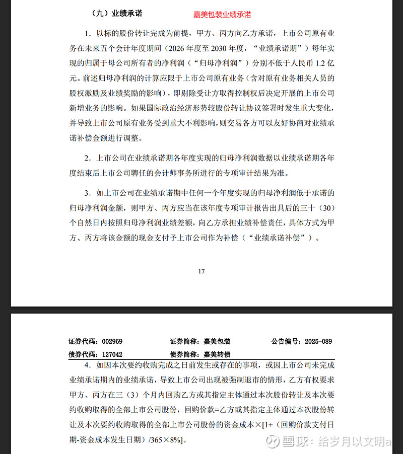 4、嘉美包装:上市公司原有业务在未来五个会计年度期间每年净利润不低于1.2亿。