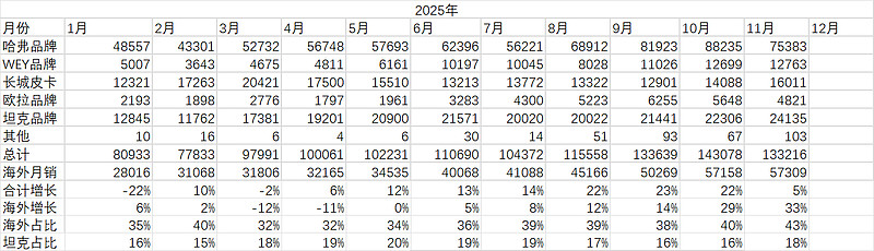 对于长城来说,核心的利润仓是坦克和出口,这两部分11月还是环比增长的。魏牌已经越过盈亏平衡线,多卖的车带来盈利弹性比较大。