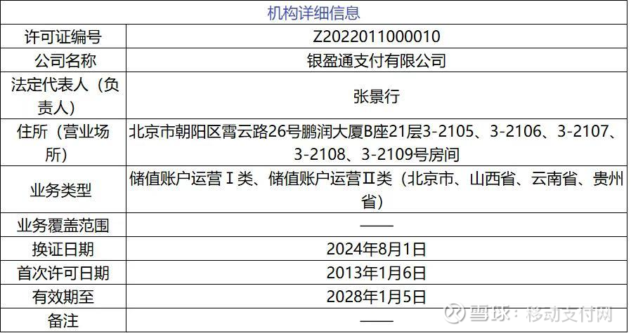 据移动支付网了解,银盈通于2005年4月在北京注册成立,2013年1月获得《支付业务许可证》,获准开展互联网支付业务以及在北京市、山西省、云南省、贵州省等地开展预付卡发行与受理业务。2023年1月,银盈通《支付业务许可证》顺利通过续展,牌照有效期延至2028年1月。随着支付业务类型重新划分,银盈通业务类型调整为“储值账户运营Ⅰ类、储值账户运营Ⅱ类(北京市、山西省、云南省、贵州省)”。