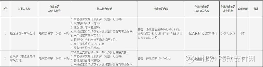 移动支付网12月26日消息,根据人民银行北京市分行最新公布的行政处罚决定信息公示表(银京罚决字【2025】65-66号),支付机构银盈通支付有限公司(简称“银盈通”)因八项违法行为被警告,没收违法所得约96.61万元,并处罚款282.72万元,罚没共计约379.33万元;相关责任人张某鹏被警告,并处罚款15万元。