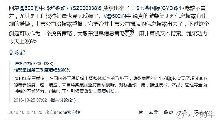 案例一,看到我评论的潍柴动力业绩情况,推测玉柴国际,刚好玉柴国际股价的启动点就是评论当天!股价到今天应该翻倍了。