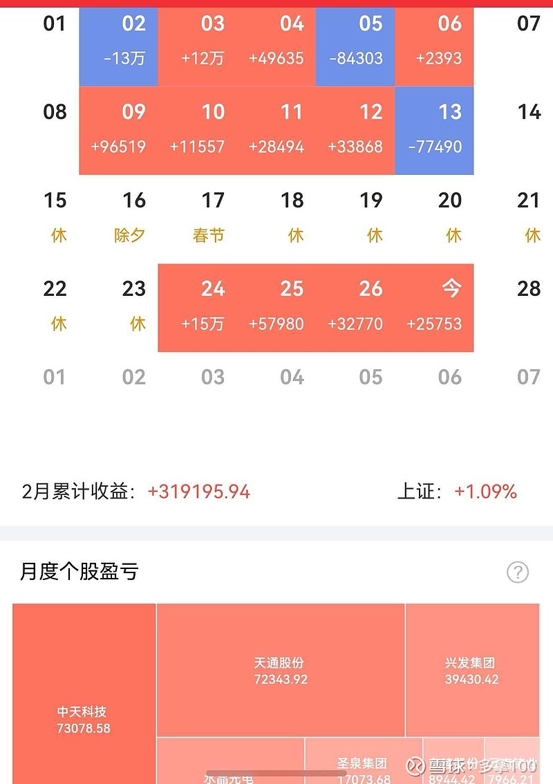 记录一下,最大的持股账户,2月份收益,感谢3大重仓股。兴发、中天和天通。