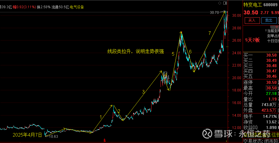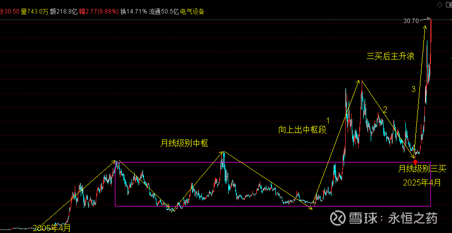 根据上述分析,特变电工自2005年4月至今的长线上涨结构清晰可辨。最近上涨的动因,正是月线级别第三类买点确认后的技术性拉升,其起涨点为2025年4月,即三买确立的位置。