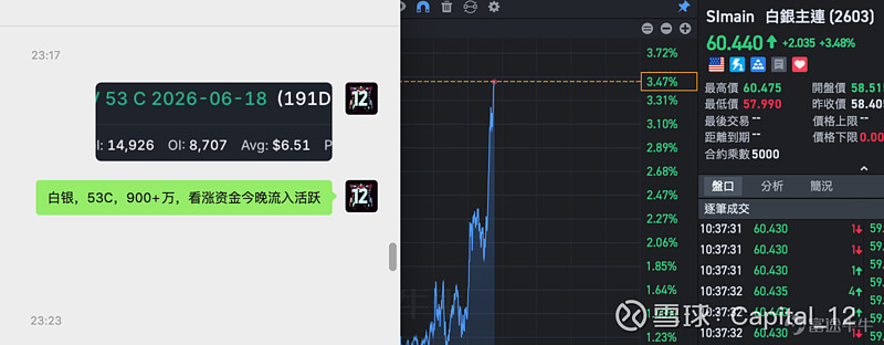 白银继续历史性高,今晚的看涨期权资金流入非常活跃