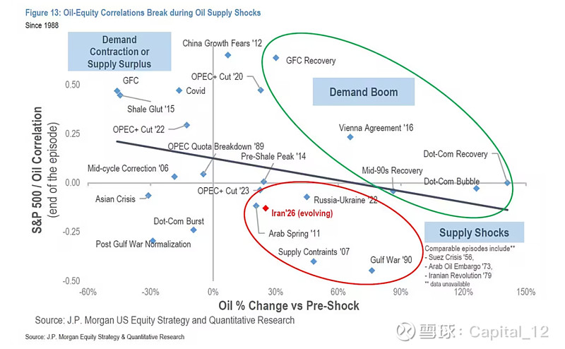 在重大的石油供应冲击期间(例如当前),油价持续飙升更可能通过侵蚀企业利润和收紧金融环境来拖累股市表现,从而导致两者相关性由正转负。$标普500 ETF-SPDR(SPY)$ $美国石油指数基金-Concierge Technologies(USO)$
