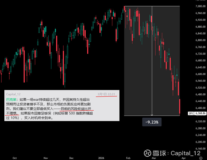 当时分享的巴克莱观点很清楚:在没有安全垫之前,盈亏比差到不值得出手。现在SPX回撤接近9%,到“底”了吗?定论还太早。放弃左侧的主观意淫。等价格自己走出来,再做右侧。$标普500ETF博时(SH513500)$ $纳指100ETF-Invesco(QQQ)$ $标普500 ETF-SPDR(SPY)$