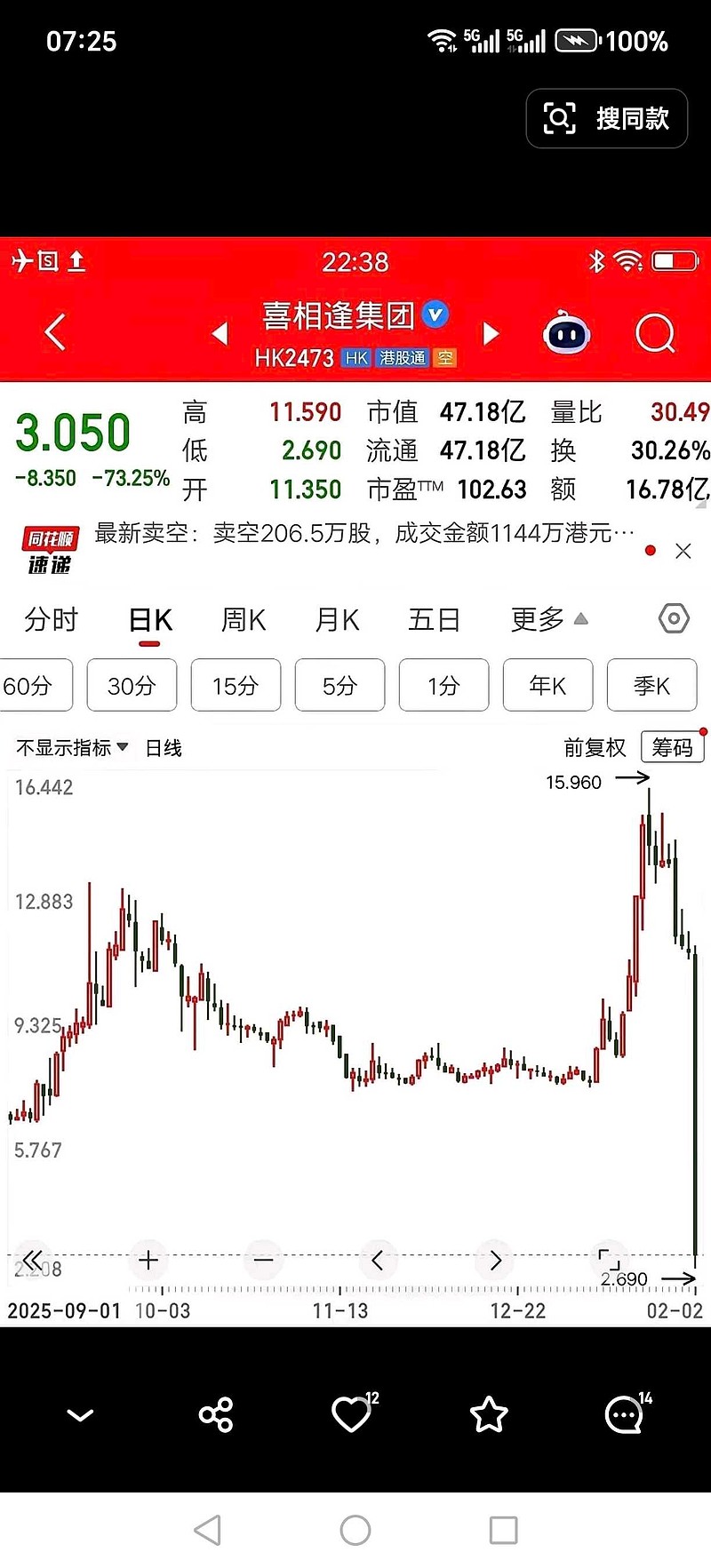 兆驰股份 港股又惊现一泻千里的奇景,看完让人心惊肉跳,不设跌幅的港股,有时让人看的后背发凉。倘若有人买到这种股票,一日回到解放前,一天下跌73%,这搁谁身上也受不了。在港股,遇上这种情况,都等不到你反应,股价就像泄气的气球一样,让你欲哭无泪。大a是慢炖,慢慢折磨你,而港股就是快刀斩乱麻,一刀毙命。港股市场港股港股行情港股指数港股走势港股股票行情