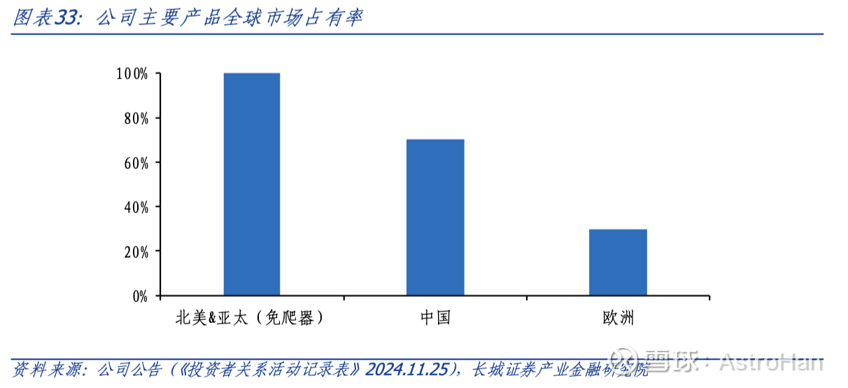 公司在国内市场占有率约 70%,在国际市场约 30%,在全球都属于领先地位。主要竞争对手包括欧洲的 Alimak、SafeWorks、德国 Hailo 等,但这些企业在中国市场的份额有限,公司在本土、北美及亚洲市场优势明显。