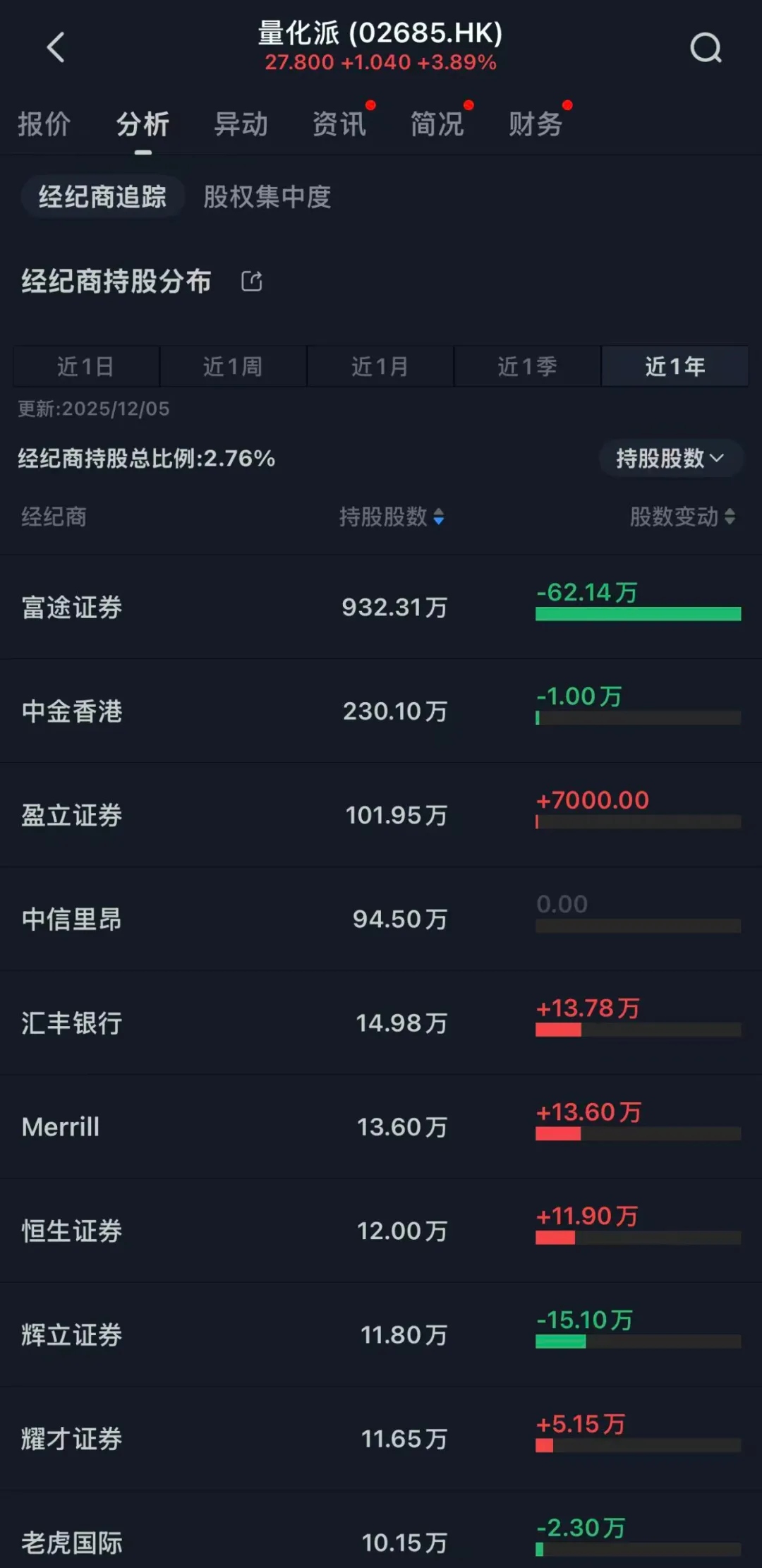 果不其然,上市后第三天已能查阅经纪商持股分布的首日动态变化。因为首日的成交量最大,最能反映资金动向。主要席位的富途仅卖出了散户持仓股数,加上辉立散户的持仓卖出,主力的主要券商席位包括富途、中金、盈立、中信里昂,没有持仓大变化。此外,首日冲高回落守在港股通门槛,筹码充分交换后就看主力的格局了。