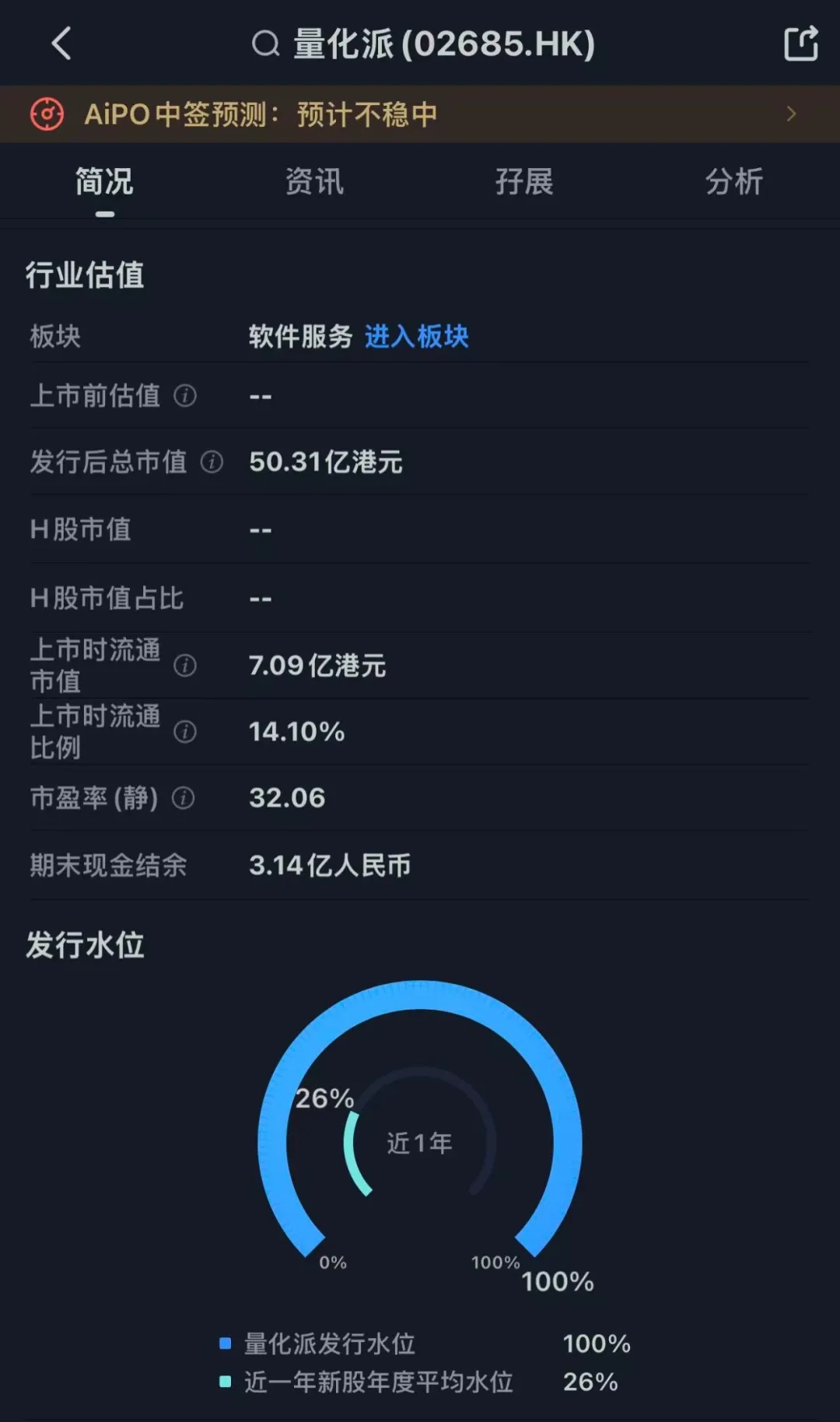 以量化派(2685)为例,发行简况一目了然,难得的红筹架构,发行市值50.31亿,通过老股东部分股份表面不禁售的方式满足自由流通比例,正式发行迷你比例,募资总额1.31亿,上市费用1.18亿,妥妥的妖气。
