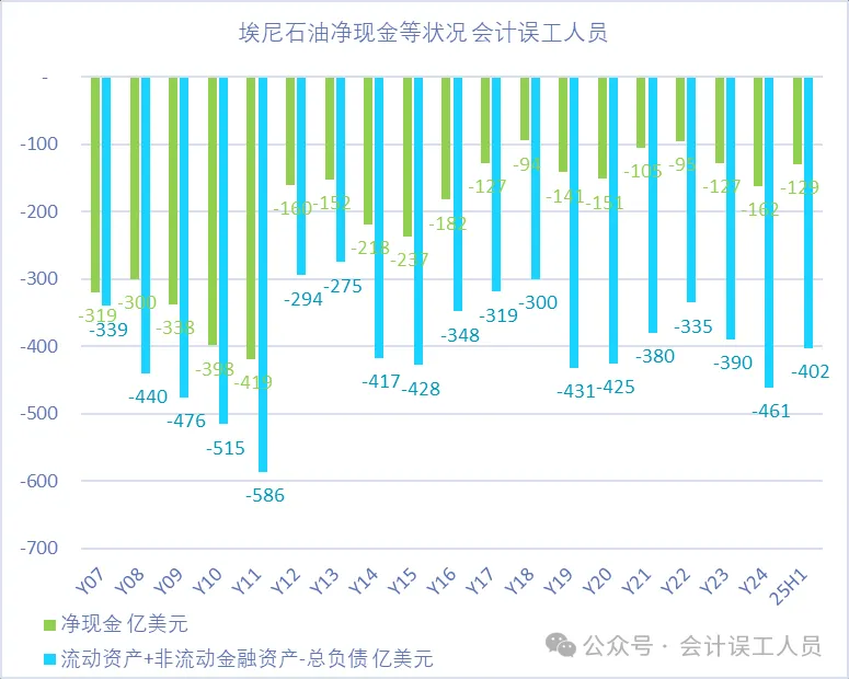 5-1)净现金:埃尼从我能找到的最早的数据2007年至今从未拥有正的净现金,2025H1的净现金是-129亿美元,