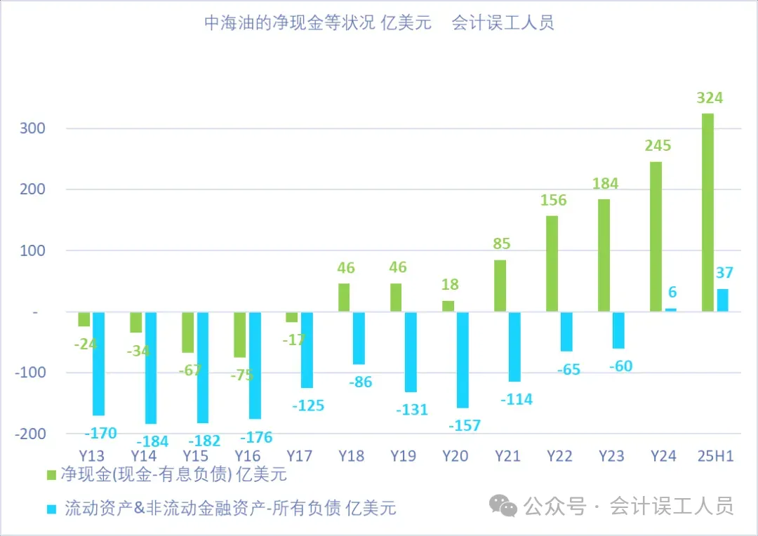 过去两年半七八十美元的油价时(2023年至2025H1),海油是埃尼利润的3-6倍,另外埃尼的资产负债需要净增加453亿的净现金,或439亿流动资产时的质量才能等于今天中海油的资产负债表质量。